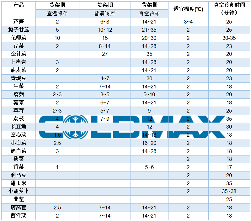 生鮮果蔬真空預(yù)冷、氣調(diào)包裝和普通冷藏保質(zhì)期對比表(單位:天)
