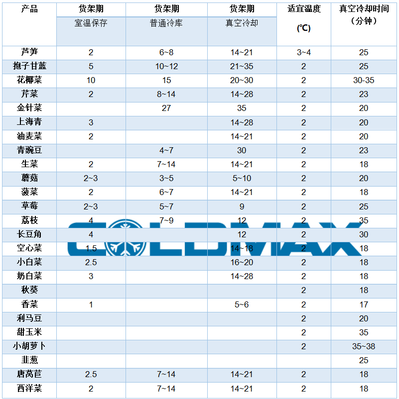 生鮮果蔬真空預冷、氣調包裝和普通冷藏保質期對比表(單位:天)
