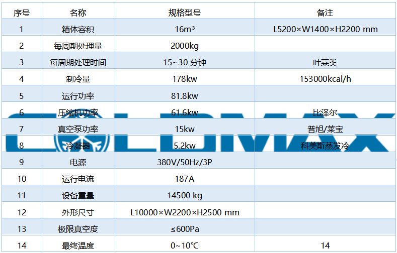 四卡板果蔬真空預冷機主要針對中型農場的預冷加工使用;真空箱容積16m3,庫容量2000kg,預冷溫度設計為0~10℃;