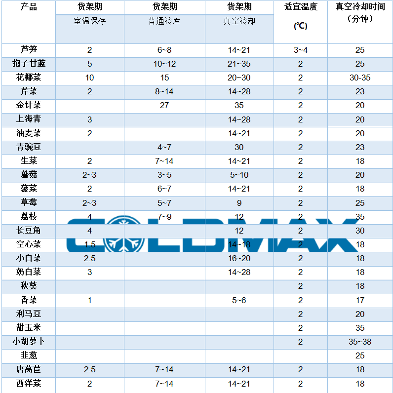 生鮮果蔬真空預冷、氣調包裝和普通冷藏保質期對比表(單位:天)