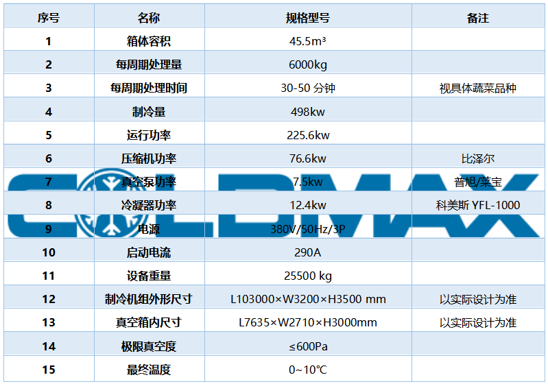 十二卡板果蔬真空預冷機主要針對中型農場的預冷加工使用;真空箱容積45.5m3,庫容量6000kg,預冷溫度設計為0~10℃;