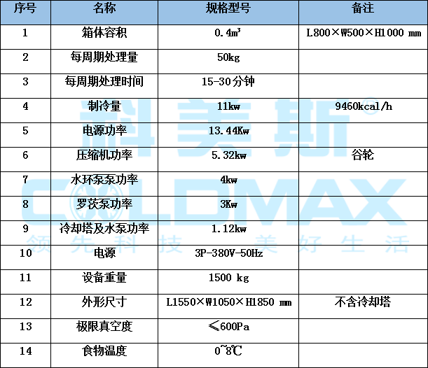 CVF-50 型號食品快速冷卻機每周期處理食品量為50kg,處理時間10~20分鐘;