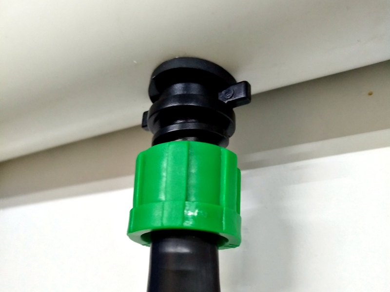 如圖所示,用專用旁通將輸水支管與滴灌帶連在一起。