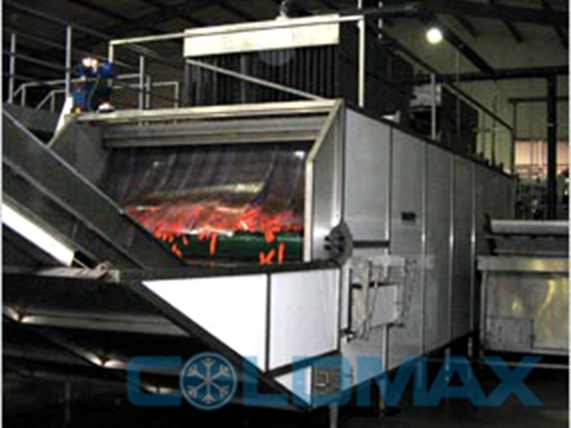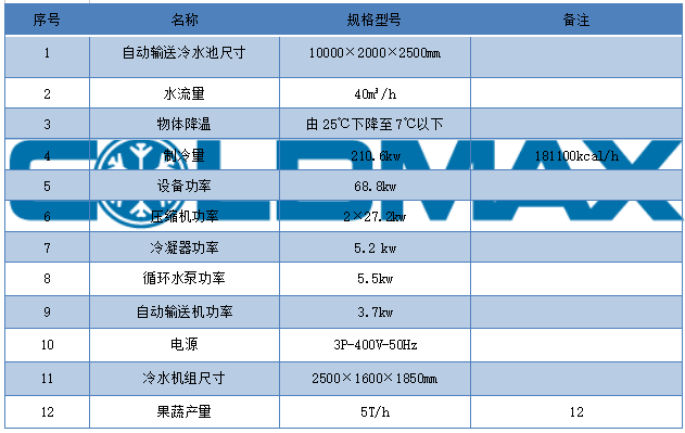 此水預冷設備,冷水水池尺寸L10×W2×H2.5米,水流量40m3/H,水預冷機出水溫度設計為2至5℃;制冷系統采用比澤爾半封閉式壓縮冷凝機組,配置殼管蒸發器,通過循環水泵循環冷卻冷水池中的水,使泡在冷水池中的果蔬能在從30℃下降至7℃左右以下(可按要求進行定制);控制系統采用LS 控制,處理設備運行中的各種反饋信息,確保設備正常運行。