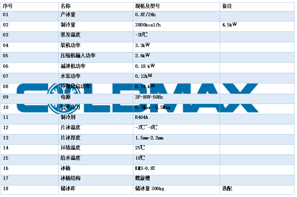 4. 高效節能: 優化設計的片冰機組,保證COLDMAX內刮式保鮮片冰機組連續性的運行,減少能量浪費的運轉。采用特殊合金材料和專利加工技術,確保高效熱傳導性能,COLDMAX片冰制冰機生產的片冰的冷卻表面為1750m2以上/噸。