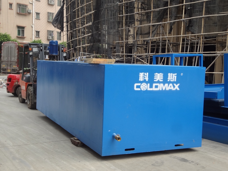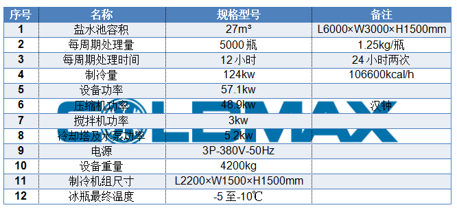 冰瓶機(jī)通常使用鹽水間接式制冷。將裝有水的塑料瓶放入鹽水池中,蓋上鹽水池蓋板,設(shè)備啟動(dòng)后,制冷機(jī)組開(kāi)始運(yùn)行;塑料瓶中的水先于鹽水池中的鹽水凝結(jié)成冰,從而實(shí)現(xiàn)冰瓶的制作。