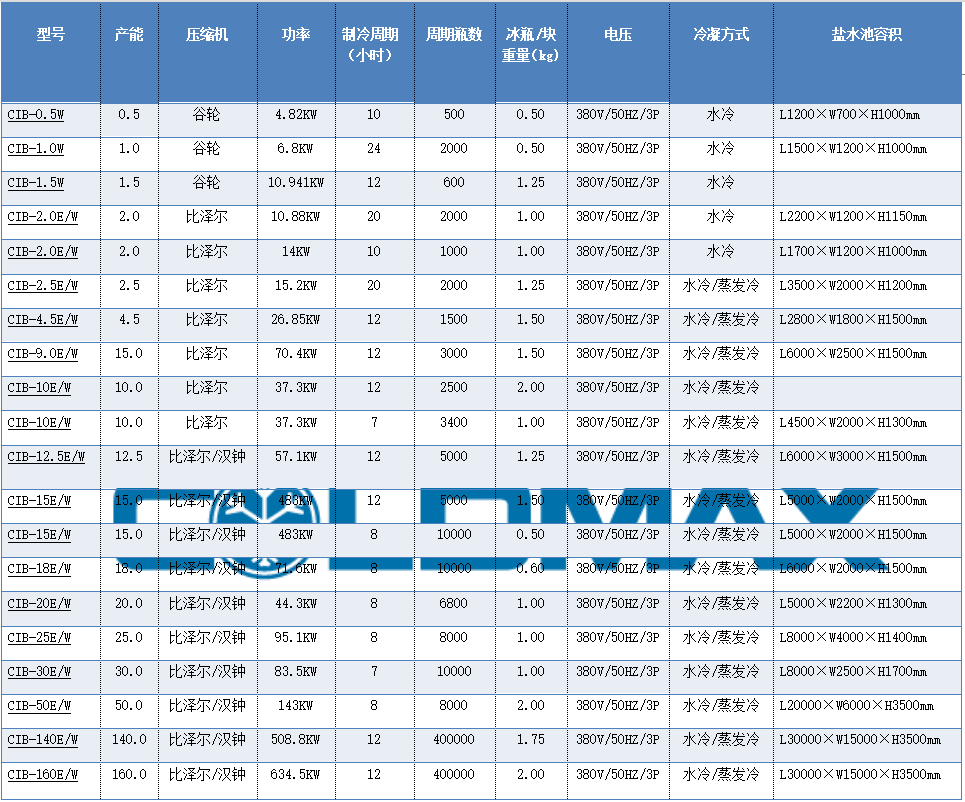 產品介紹冰瓶機是制冰機中的一種,與其它制冰機相比,區別在于生產出的冰是裝在塑料瓶中,主要用于需要冷卻但不允許帶入融化水的特殊場合,用的最多是在蔬菜運輸過程中的保鮮。廣泛應用于工廠降溫、長途運輸、水產食品保鮮、水果蔬菜保鮮、特殊領域的降溫冷卻等CIB-20E/W 型號冰瓶機日產量:20T 20400瓶,每瓶1.0kg;工作原理冰瓶機通常使用鹽水間接式制冷。將裝有水的塑料瓶放入鹽水池中,蓋上鹽水池蓋板,設備啟