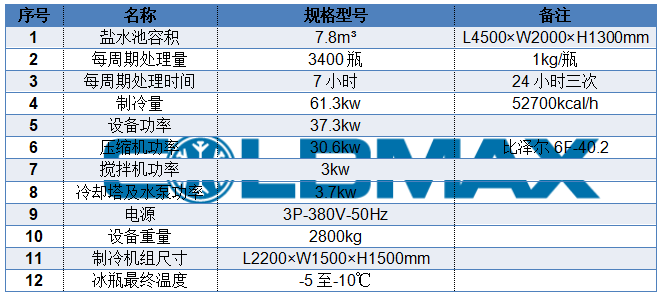 冰瓶機通常使用鹽水間接式制冷。將裝有水的塑料瓶放入鹽水池中,蓋上鹽水池蓋板,設備啟動后,制冷機組開始運行;塑料瓶中的水先于鹽水池中的鹽水凝結成冰,從而實現冰瓶的制作。