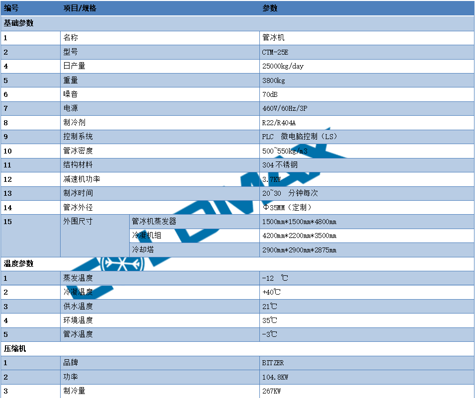 管冰機配備數字壓控、機械壓控和時間繼電器三重保護,嚴格控制冰塊成型速度,防止不銹鋼管凍裂,冰塊成型后在上述三種控制作用下制冰系統向蒸發器供熱,使得冰塊自由下落,與此同時與冰刀相切,形成長度 3-125px 不等的圓柱形冰塊,即管冰。