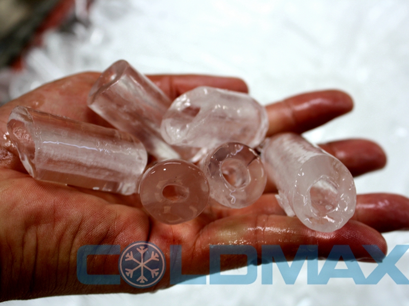 ●管冰呈中空圓柱形狀,外直徑尺寸為φ26mm、φ28mm、φ30mm、φ34mm等多種規格,長度27~50mm不等。內孔直徑可根據制冰時間調整,一般控制在φ5~10mm之間。