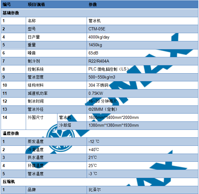 管冰機配備數字壓控、機械壓控和時間繼電器三重保護,嚴格控制冰塊成型速度,防止不銹鋼管凍裂,冰塊成型后在上述三種控制作用下制冰系統向蒸發器供熱,使得冰塊自由下落,與此同時與冰刀相切,形成長度 3-125px 不等的圓柱形冰塊,即管冰。