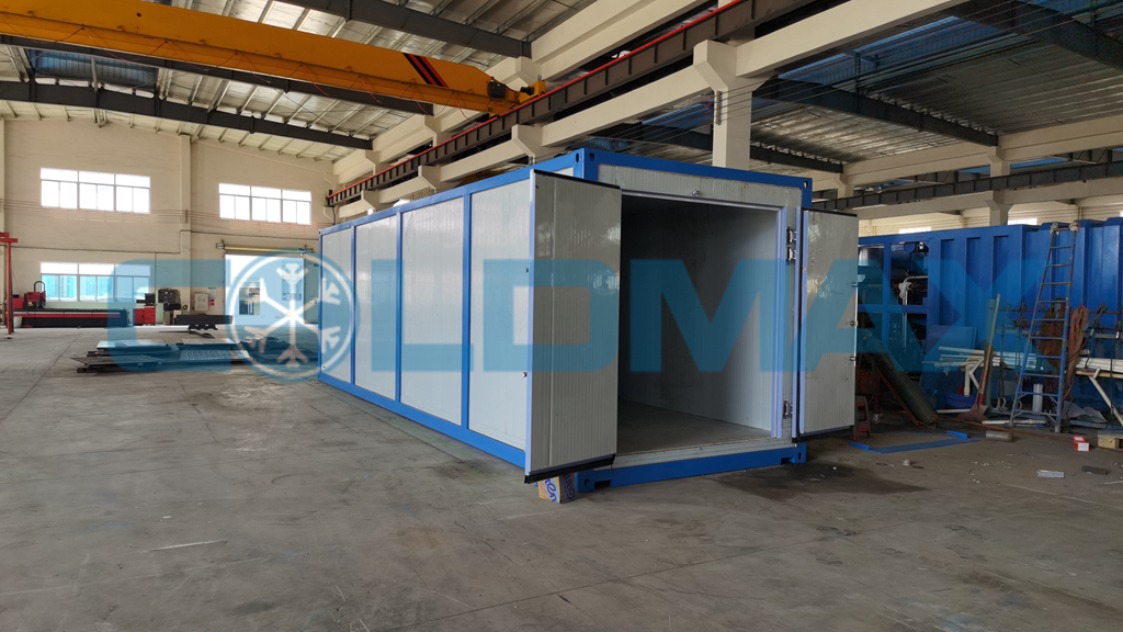 本項目為一套標準9.6米廂式保溫貨柜及配套的制冷系統和壓差系統組成,每次進貨量為5噸,主要功能為將果蔬快速降溫的設備。