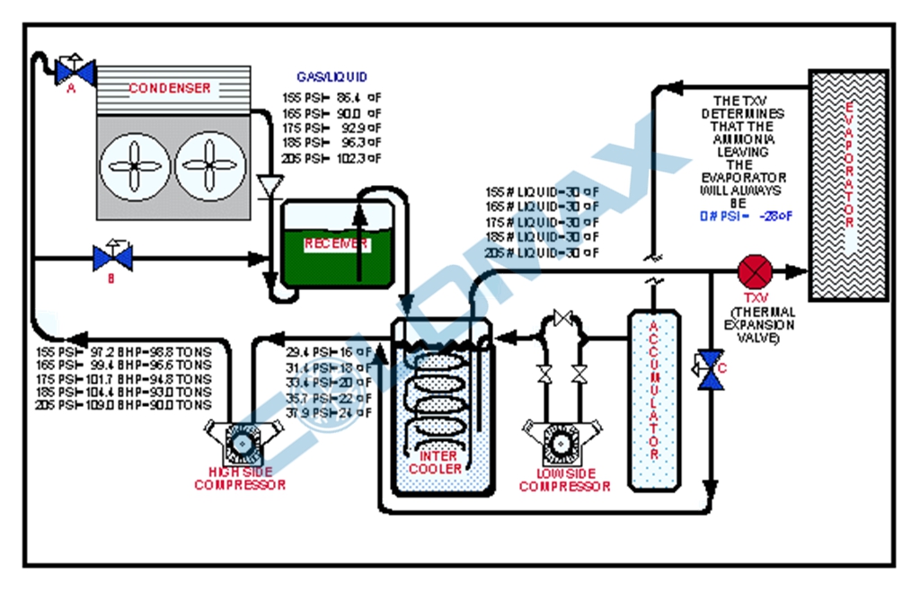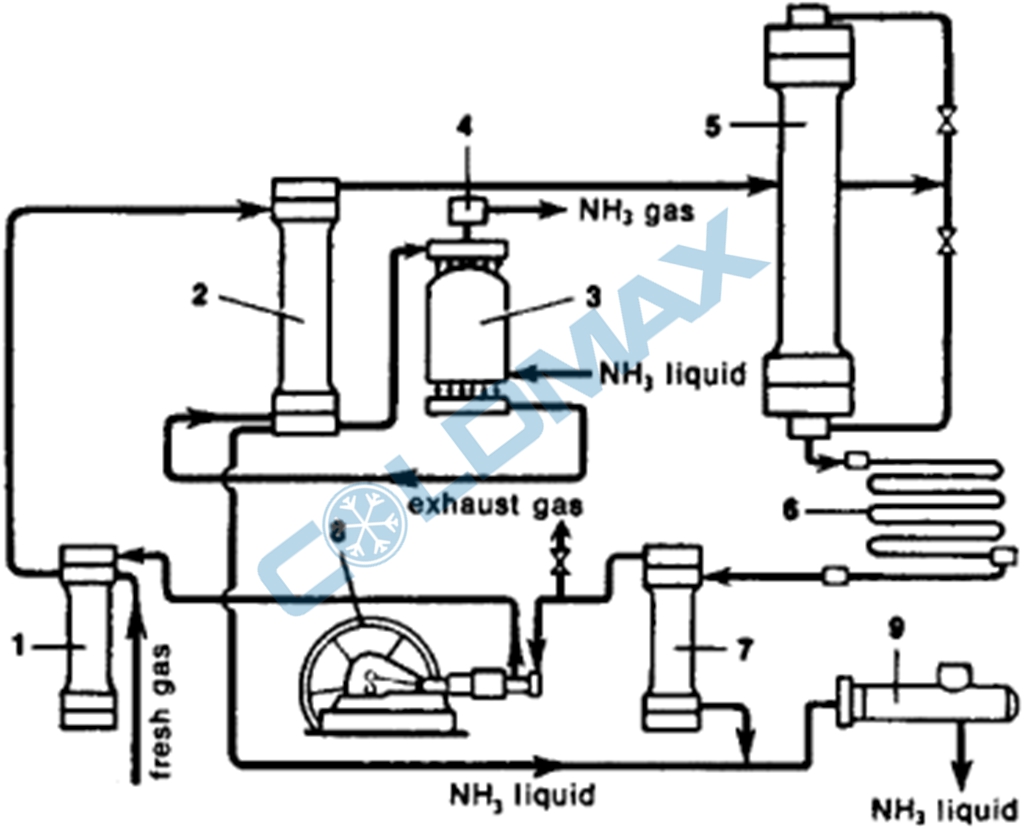 液態(tài)氨在蒸發(fā)器中吸收被冷卻物的熱量之后,汽化成低壓低溫的氨氣,然后被壓縮機(jī)吸入,壓縮成高壓高溫的氨氣后排入冷凝器。