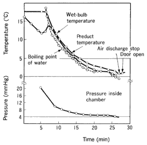 真空預(yù)冷是將果蔬、鮮花、肉類、熟食等農(nóng)產(chǎn)品置于保溫的真空室里,用真空泵對(duì)室內(nèi)抽真空。當(dāng)室內(nèi)真空度達(dá)到果蔬溫度對(duì)應(yīng)的水蒸汽的飽和壓力時(shí),果蔬等農(nóng)產(chǎn)品表面間隙中的水分開始蒸發(fā),蒸發(fā)時(shí)將帶走蒸發(fā)潛熱,使農(nóng)產(chǎn)品溫度降低,進(jìn)一步降壓,直至果蔬冷卻至所需的溫度。