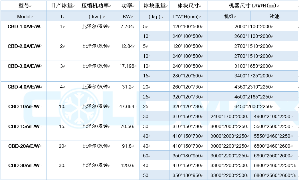 塊冰機的型號: 標準型號見下表,如果需要特殊型號和尺寸,請聯系科美斯銷售員