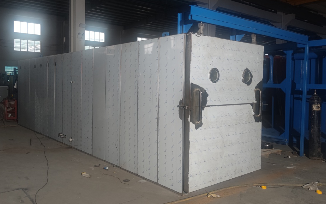 本項目用于速凍然后冷凍干燥加工設備,真空箱擱板面積5㎡,干燥倉尺寸:¢1800X5000mm(鋁擱板面積5m2),庫容量50kg;冷凍干燥就是把含有大量水分的物質,,在真空箱內先凍結成固體,然后在真空條件下使水蒸氣直接升華出來,而物質本身剩留在凍結時的擱架中,因此它干燥后疏松多孔體積不變,為了加快升華速度,擱架會同時進行加適當加熱,整個干燥過程都是在較低溫度下進行的,加熱設計在30℃,制冷原理是依據水隨壓力降低其沸點也降低的物理性質,將預食品置于真空箱中抽真空,當壓力達到一定數值時,食品表面的水分開始蒸發,并帶走食品內部的熱量,從而使食品整體達到快速降溫的效果。