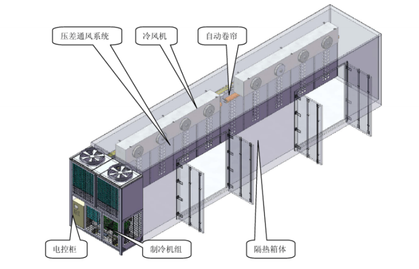壓差預冷是強制通風預冷的一種,它以空氣為冷卻介質,通過機械加壓在預冷果蔬兩側產生一定壓力差,迫使冷空氣全部通過果蔬充填層,增加冷空氣與冷卻物間的接觸面積,從而使預冷食品被迅速冷卻的方法。這種方法冷卻速度快、降溫均勻和適用性強,特別適用于蔬菜、水果和鮮切花卉。